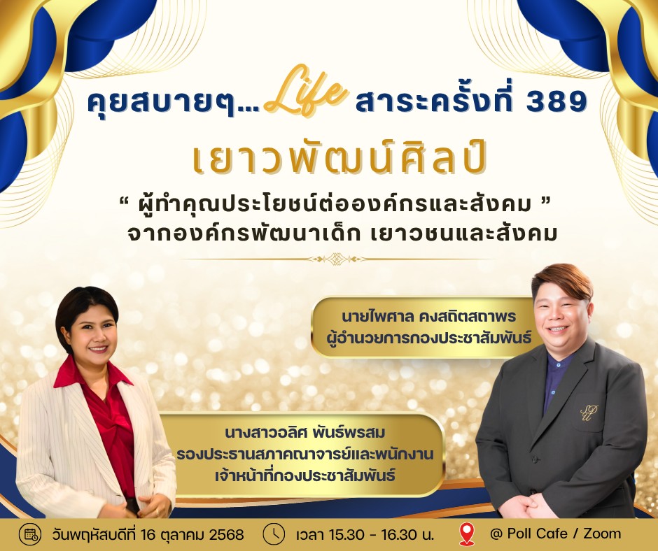 สวนดุสิตโพล มหาวิทยาลัยสวนดุสิต จัดกิจกรรม “คุยสบายๆ… Life สาระ” ครั้งที่ 389 หัวข้อ เยาวพัฒน์ศิลป์ “ผู้ทำคุณประโยชน์ต่อองค์กรและสังคม” จากองค์กรพัฒนาเด็ก เยาวชนและสังคม พบกับ นายไพศาล คงสถิตสถาพร ผู้อำนวยการกองประชาสัมพันธ์ และนางสาวอลิศ พันธ์พรสม รองประธานสภาคณาจารย์และพนักงาน เมื่อวันที่ 16 ตุลาคม 2568 ณ Poll Café มหาวิทยาลัยสวนดุสิต และออนไลน์ผ่านโปรแกรม Zoom Meeting