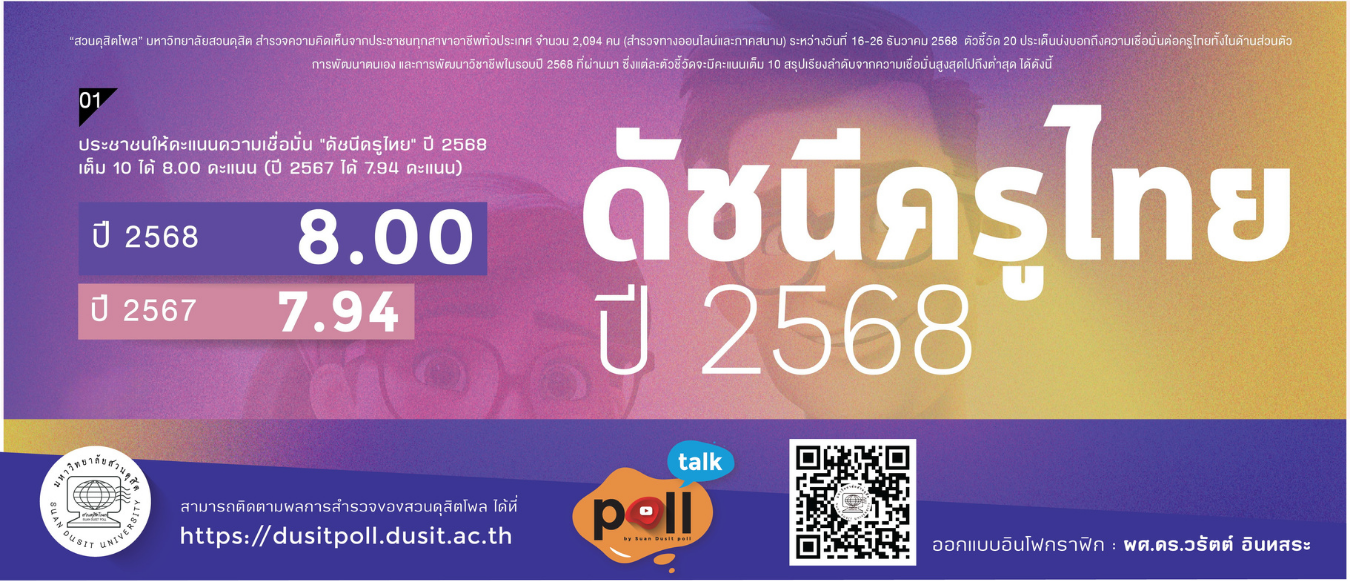 สวนดุสิตโพล มหาวิทยาลัยสวนดุสิต สำรวจความคิดเห็นประชาชนทุกสาขาอาชีพทั่วประเทศ เรื่อง “ดัชนีครูไทย ปี 2568” กลุ่มตัวอย่างจำนวน 2,094 คน สำรวจระหว่างวันที่ 16–26 ธันวาคม 2568 เพื่อสะท้อนระดับความเชื่อมั่นของสังคมไทยต่อวิชาชีพครู ผ่านตัวชี้วัด 20 ประเด็น ครอบคลุมทั้งมิติบุคลิกภาพ คุณธรรม จริยธรรม สมรรถนะวิชาชีพ การพัฒนาตนเอง และการปรับตัวต่อบริบทการเปลี่ยนแปลงทางสังคมและเทคโนโลยี