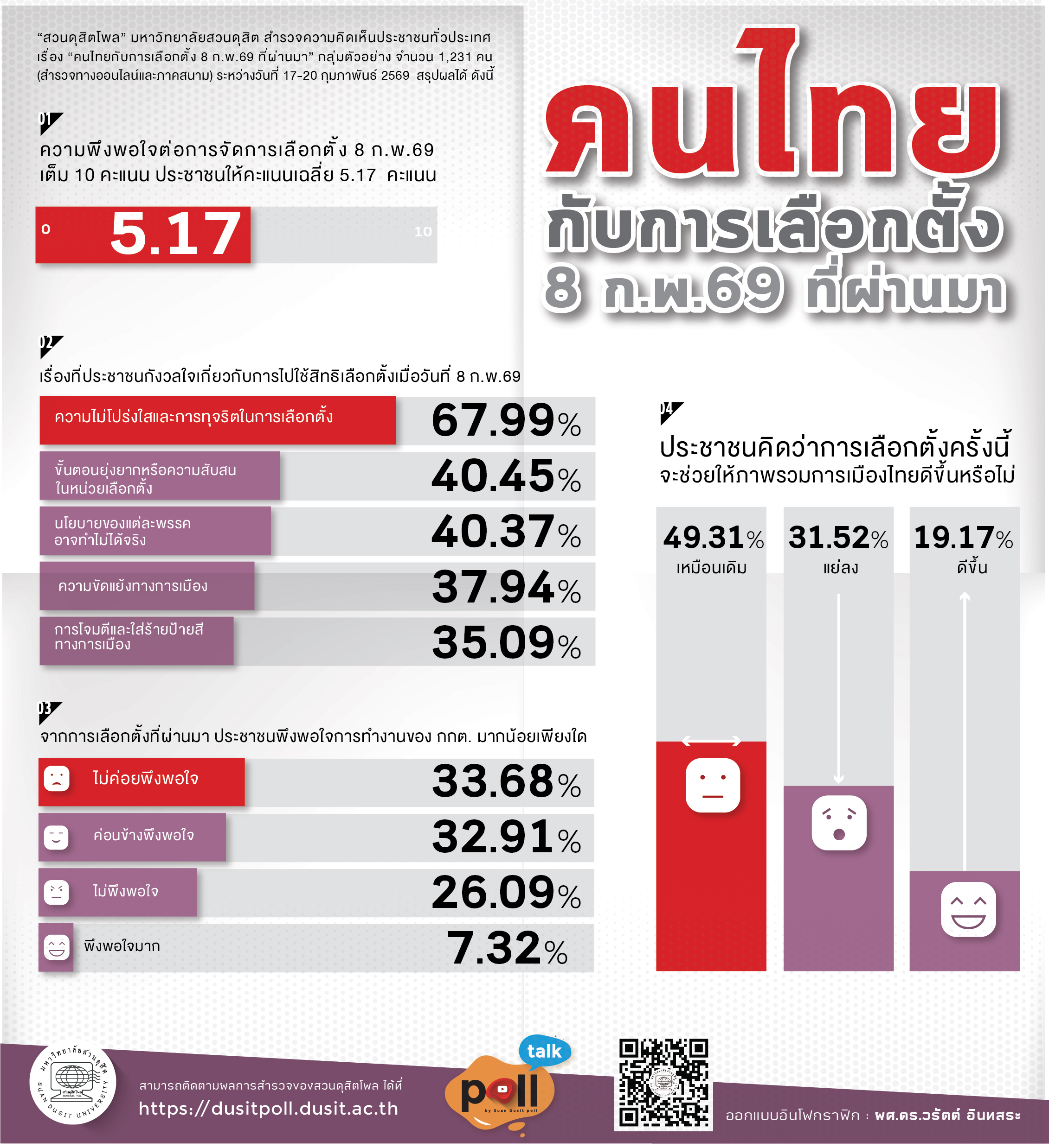 สวนดุสิตโพลสำรวจความคิดเห็นประชาชนทั่วประเทศ เรื่อง “คนไทยกับการเลือกตั้ง 8 ก.พ.69 ที่ผ่านมา” กลุ่มตัวอย่าง จำนวน 1,231 คน ระหว่างวันที่ 17-20 กุมภาพันธ์
