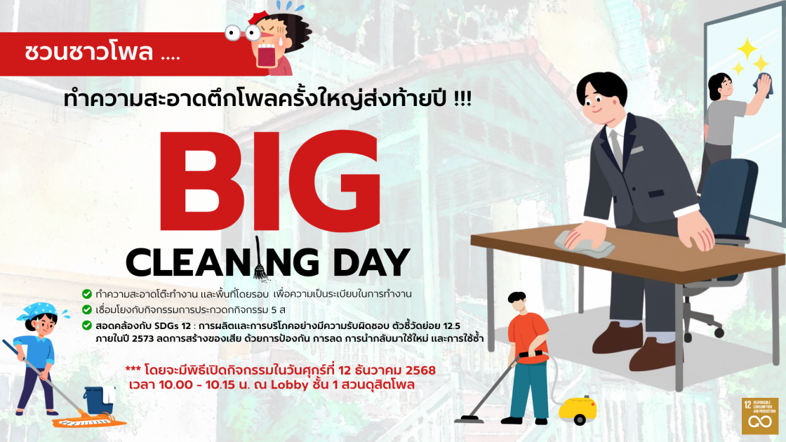 สวนดุสิตโพลจัดกิจกรรม BIG CLEANING DAY ทำความสะอาดครั้งใหญ่ส่งท้ายปี 2568 โดยเชิญชวนบุคลากรร่วมกันทำความสะอาดบริเวณโต๊ะทำงานและพื้นที่ภายในสวนดุสิตโพล โดยมีวัตถุประสงค์เพื่อเชื่อมโยงกิจกรรม 5 ส. ที่เป็นแนวทางในการพัฒนาพื้นที่ทำงานให้สะอาด เป็นระเบียบ สะดวกต่อการใช้งาน และปลูกฝังจิตสำนึกด้านความรับผิดชอบร่วมกันภายในองค์กร ในวันศุกร์ที่ 12 ธันวาคม 2568 เวลา 10.00–10.15 น. ณ บริเวณ Lobby ชั้น 1 สวนดุสิตโพล สอดคล้องกับเป้าหมายการพัฒนาที่ยั่งยืน SDGs เป้าหมายที่ 12 การผลิตและการบริโภคอย่างมีความรับผิดชอบ โดยเฉพาะตัวชี้วัดย่อย 12.5 ที่มุ่งลดการสร้างของเสีย การใช้ซ้ำ และการนำกลับมาใช้ใหม่