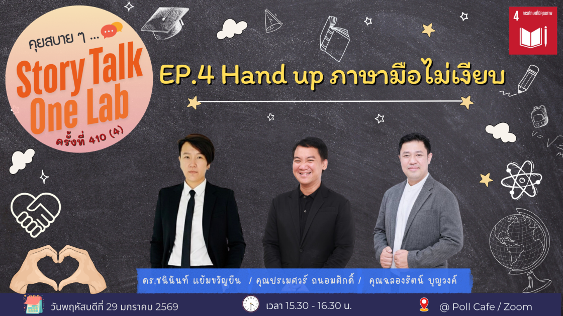 สวนดุสิตโพล ร่วมกับคณะครุศาสตร์ จัดกิจกรรม “คุยสบายๆ… Story Talk One Lab“ ครั้งที่ 410 (4) ประจำเดือนมกราคม 2569 Concept: “เปิดโลกความเท่าเทียมทางการศึกษา” กับคณะครุศาสตร์ มหาวิทยาลัยสวนดุสิต EP.4 “Hand Up ภาษามือไม่เงียบ” โดย ดร.ชนินันท์ แย้มขวัญยืน คุณฉลองรัตน์ บุญวงค์ และ คุณปรเมศวร์ ถนอมศักดิ์ จากชมรมภาษามือไทย ศูนย์การศึกษาพิเศษ คณะครุศาสตร์ จัดขึ้นในวันพฤหัสบดีที่ 5 กุมภาพันธ์ 2569 ณ Poll Cafe และออนไลน์ผ่านระบบ Zoom