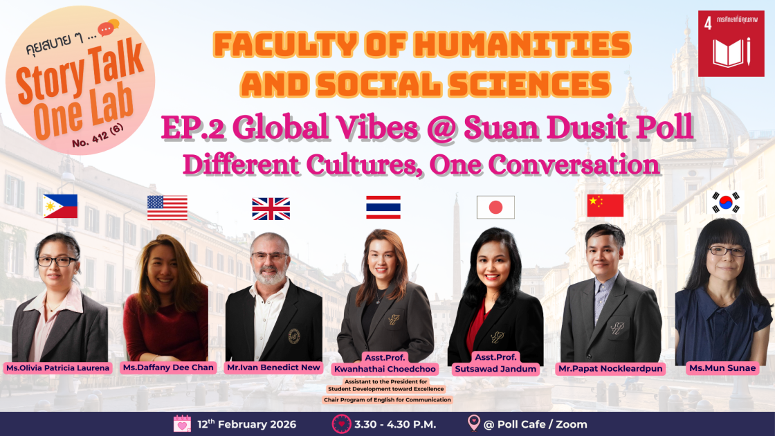 สวนดุสิตโพล ร่วมกับคณะมนุษยศาสตร์และสังคมศาสตร์ จัดกิจกรรม “คุยสบายๆ… Story Talk One Lab“ ครั้งที่ 412(6) EP.2 Global Vibes @ Suan Dusit Poll Different Cultures, One Conversation By
