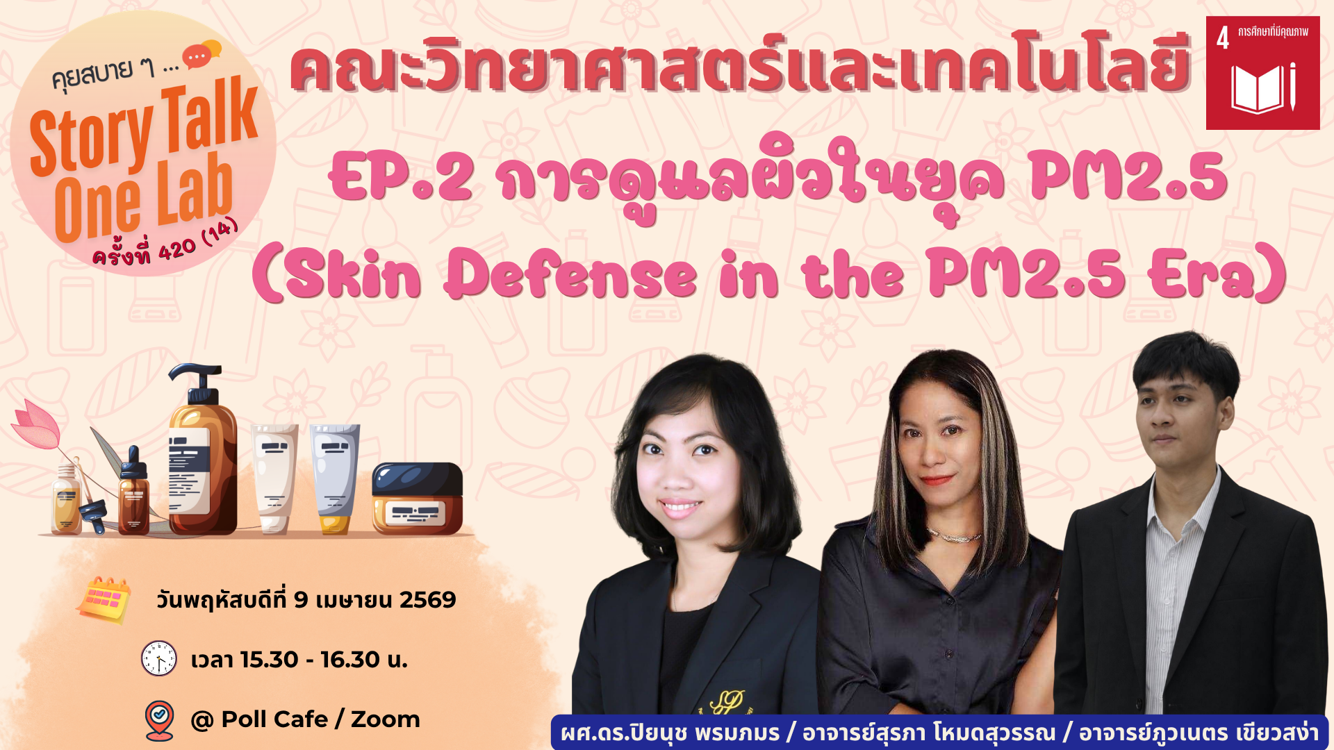 กิจกรรม “คุยสบายๆ… Story Talk One Lab“ ครั้งที่ 420(14) ประจำเดือนเมษายน EP.2 การดูแลผิวในยุค PM2.5 (Skin Defense in the PM2.5 Era) ในวันพฤหัสบดีที่ 2 เมษายน 2569 เวลา 15.30-16.30 ณ Poll Cafe และออนไลน์ผ่านระบบ Zoom โดย ผศ.ดร.ปิยนุช พรมภมร (กรรมการบริหารหลักสูตรวิทยาศาสตร์เครื่องสำอาง) อาจารย์สุรภา โหมดสุวรรณ (กรรมการบริหารหลักสูตรวิทยาศาสตร์เครื่องสำอาง) อาจารย์ภูวเนตร เขียวสง่า (อาจารย์ประจำหลักสูตรวิทยาศาสตร์เครื่องสำอาง) สอดคล้องกับ SDGs:4 การศึกษาที่มีคุณภาาพ (Quality Education) ตัวชี้วัด 4.3.5 ด้านนโยบายการเข้าถึงการเรียนรู้ตลอดชีวิต (Lifelong Learning Access Policy) เนื่องจากกิจกรรมเปิดโอกาสให้ทุกคนได้เข้าถึงองค์ความรู้ ร่วมมือกับคณะและหน่วยงาน ต่างๆ ในมหาวิทยาลัย เพื่อแลกเปลี่ยนประสบการณ์การเรียนรู้ซึ่งกันและกัน