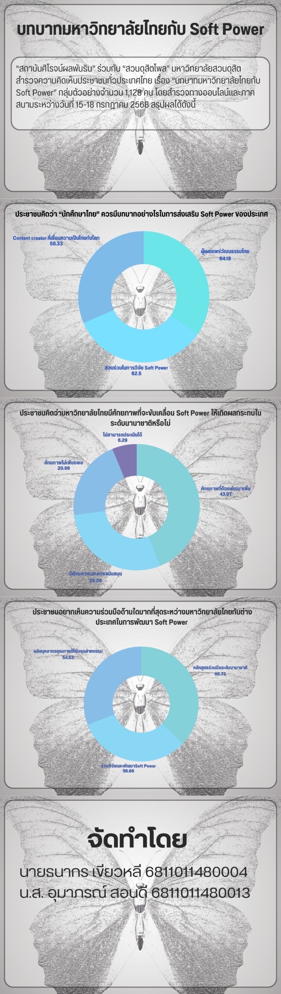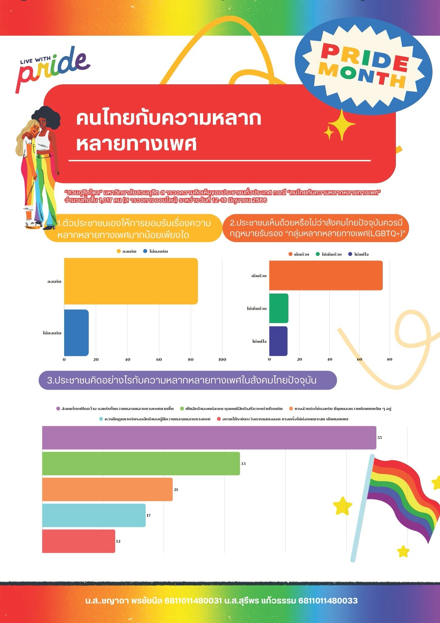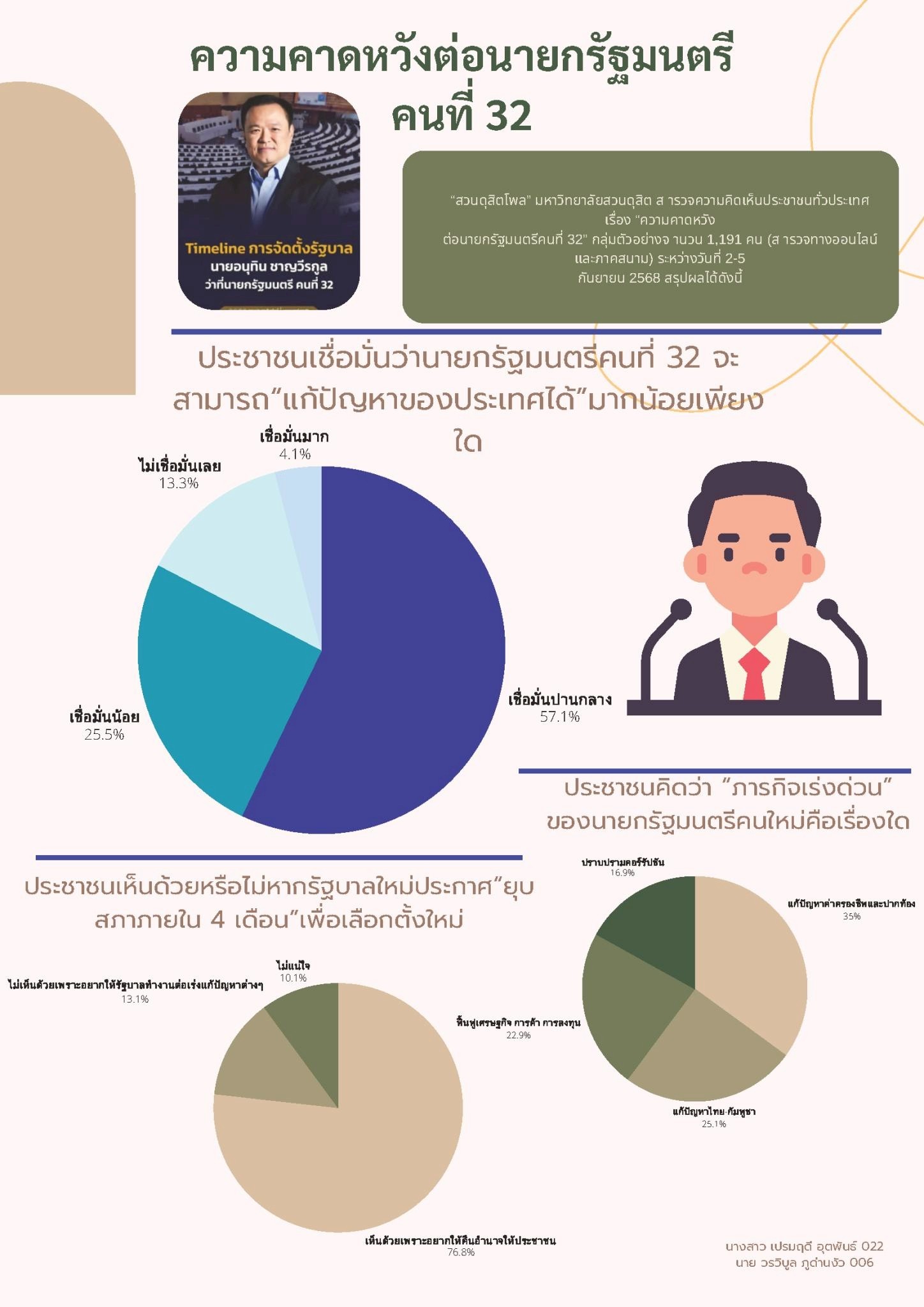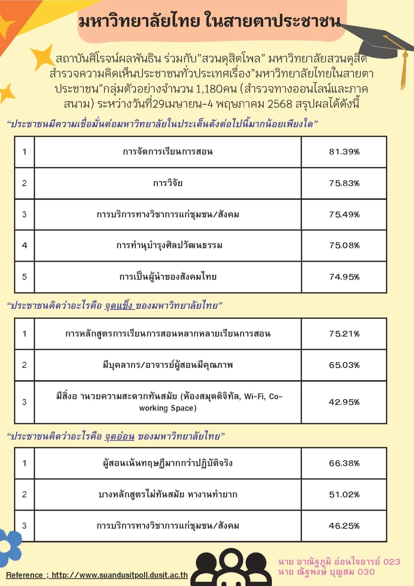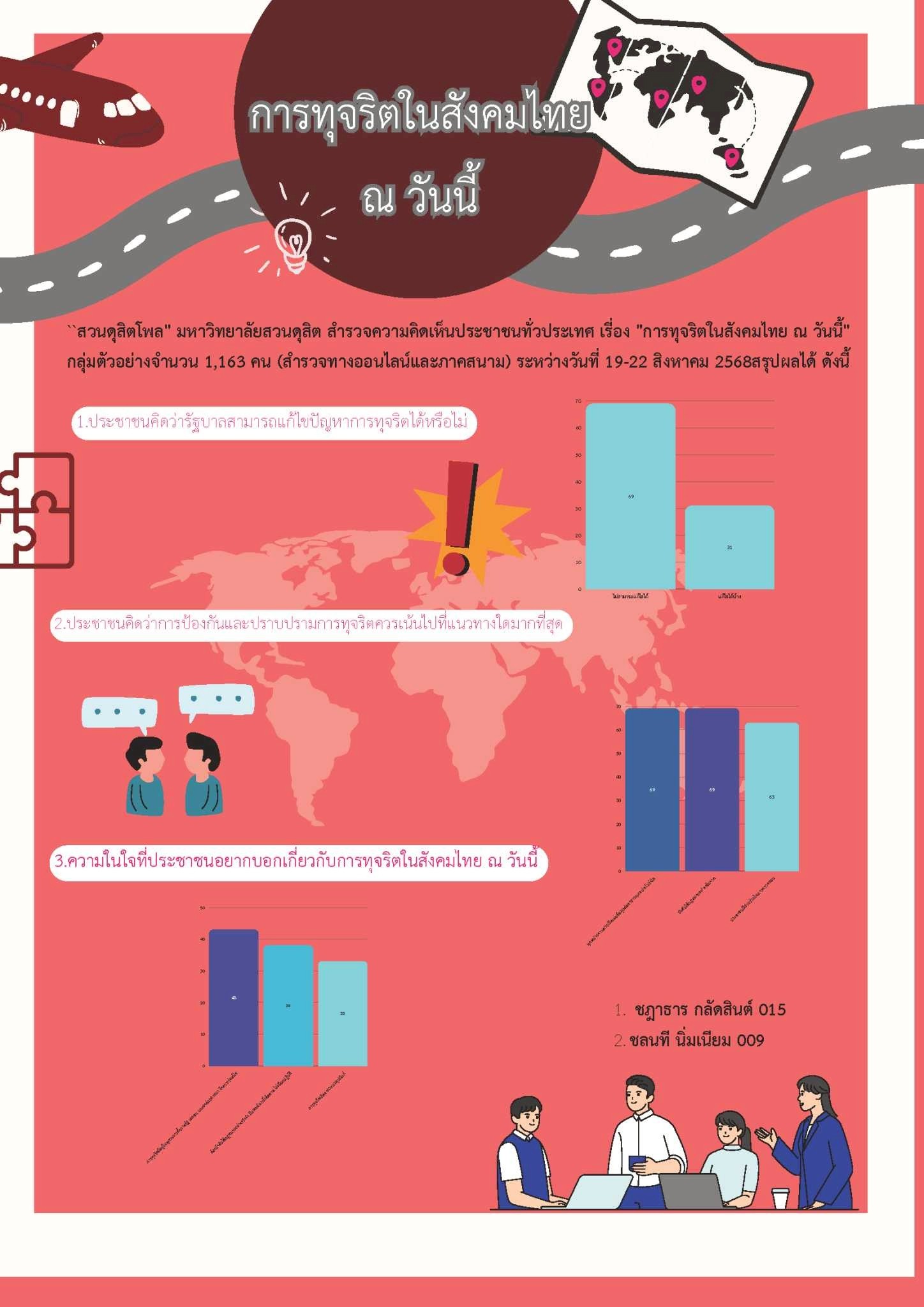 - SDG 17: Partnerships for the Goals — เชื่อมโยงเครือข่ายภายในมหาวิทยาลัยระหว่างหน่วยงาน (สวนดุสิตโพล) และนักศึกษาเพื่อร่วมสร้างองค์ความรู้และผลงานที่ใช้ได้จริง