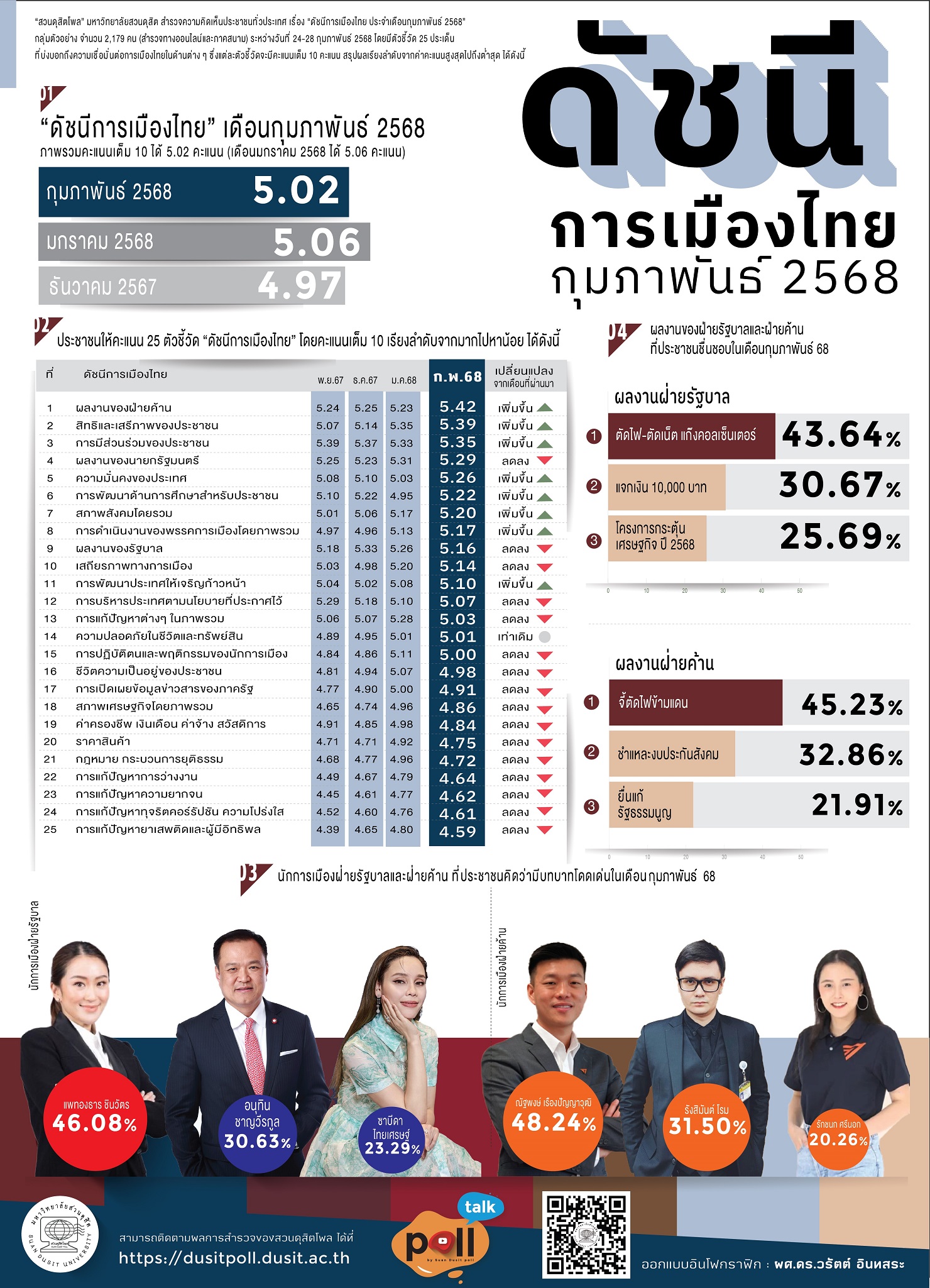 | "ดัชนีการเมืองไทย" เดือนกุมภาพันธ์ 2568 |  |  | 02/03/2568 | 2568 |