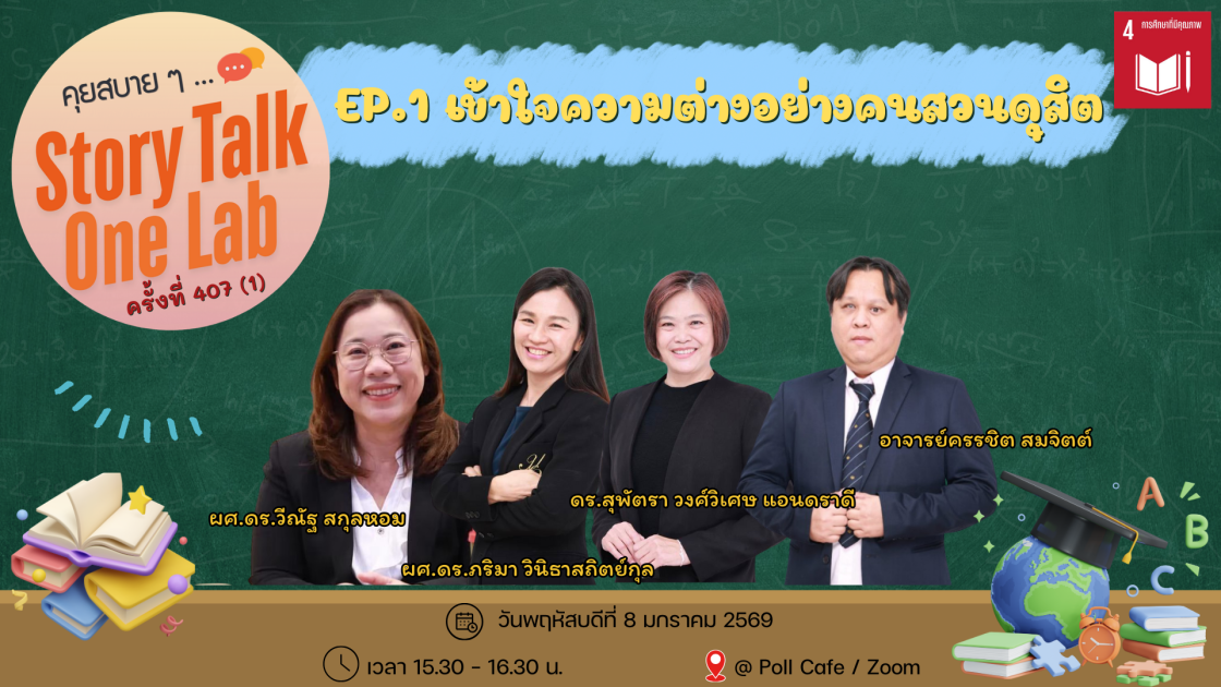 กิจกรรม “คุยสบายๆ… Story Talk One Lab“ ครั้งที่ 407(1) ประจำเดือนมกราคม Concept: “เปิดโลกความเท่าเทียมทางการศึกษา” กับคณะครุศาสตร์ มหาวิทยาลัยสวนดุสิต EP.1 “เข้าใจความต่างอย่างคนสวนดุสิต” พบกับ ผศ.ดร.วีณัฐ สกุลหอม คณบดีคณะครุศาสตร์ ผศ.ดร.ภริมา วินิธาสถิตย์กุล หัวหน้าศูนย์การศึกษาพิเศษ ดร.สุพัตรา วงศ์วิเศษ แอนดราดี รองหัวหน้าศูนย์การศึกษาพิเศษ และอาจารย์ครรชิต สมจิตต์ อาจารย์ศูนย์การศึกษาพิเศษ สอดคล้องกับ SDGs 4 : (Quality Education) การศึกษาที่มีคุณภาพ