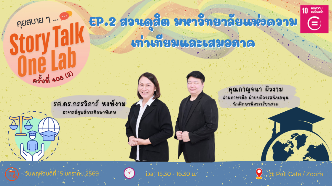 กิจกรรม “คุยสบายๆ… Story Talk One Lab“ ครั้งที่ 408(2) ประจำเดือนมกราคม Concept: “เปิดโลกความเท่าเทียมทางการศึกษา” กับคณะครุศาสตร์ มหาวิทยาลัยสวนดุสิต EP.2 “สวนดุสิต มหาวิทยาลัย แห่งความเท่าเทียมและเสมอภาค” พบกับ รศ.ดร.กรรวิภาร์ หงษ์งาม อาจารย์ศูนย์การศึกษาพิเศษ และ คุณกาญจนา ผิวงาม ล่ามภาษามือ ฝ่ายบริการสนับสนุนนักศึกษาพิการเรียนร่วม สอดคล้องกับ SDGs 10 : (Reduce Inequality) ลดความเหลื่อมล้ำ