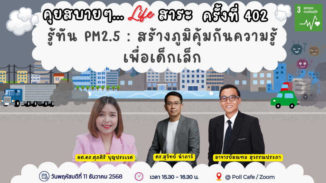 กิจกรรม “คุยสบายๆ… Life สาระ” ครั้งที่ 402 หัวข้อ : รู้ทัน PM 2.5 สร้างภูมิคุ้มกันความรู้เพื่อเด็กเล็ก โดย ผศ.ดร.ศุภศิริ บุญประเวศ ดร.สุวิทย์ นำภาว์ และ อาจารย์มณฑล สุวรรณประภา สอดคล้องกับ SDGs 3 (Good Health and Well-being) สุขภาพและความเป็นอยู่ที่ดี ในด้านของการส่งเสริมสุขภาพและการให้ความรู้ให้แก่นักศึกษาและบุคลากรในมหาวิทยาลัย