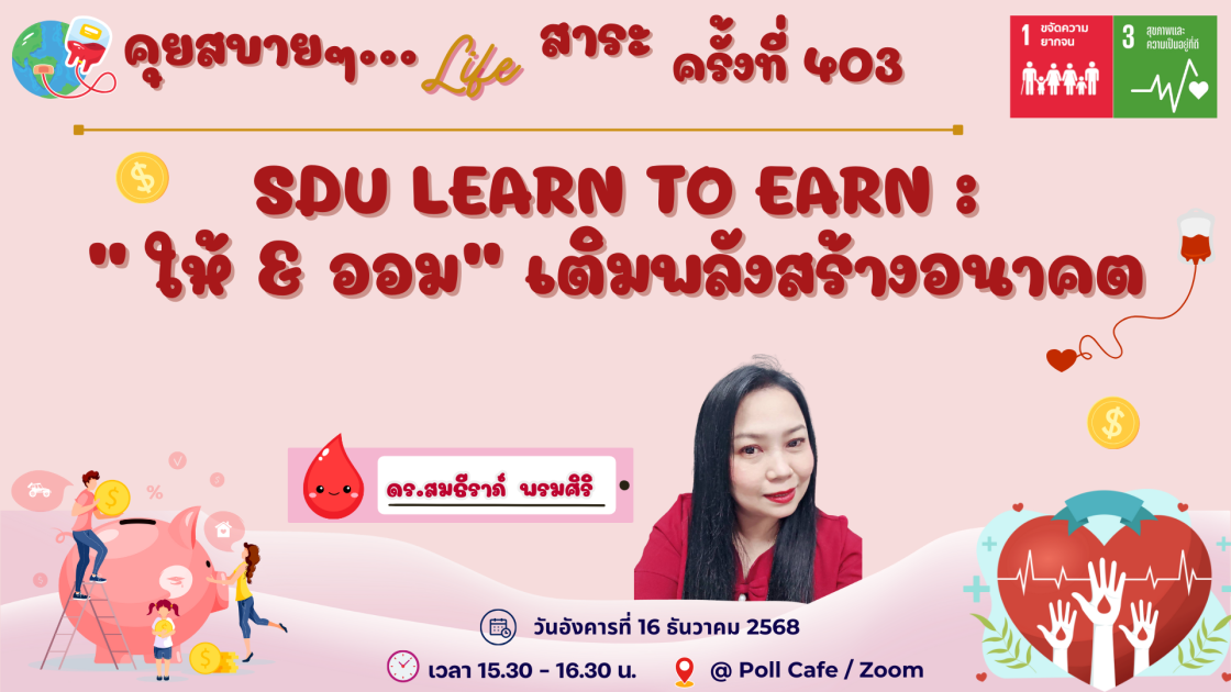 กิจกรรม “คุยสบายๆ… Life สาระ” ครั้งที่ 403 หัวข้อ : SDU Learn to Earn: “ให้ & ออม” เติมพลังสร้างอนาคต พบกับ ดร.สมธีราภ์ พรมศิริ ดร.นกุล ฤกษ์จริจุมพล และ นางสาวอมรา เหมพิทักษ์ สอดคล้องกับ SDGs 1 (No Poverty) ขจัดความยากจน ในด้านการส่งเสริมความรู้ด้านการออมและการวางแผนทางการเงินให้กับนักศึกษา และ SDGs 3 (Good Health and Well-being) สุขภาพและความเป็นอยู่ที่ดี ในด้านการส่งเสริม สนับสนุนระบบสาธารณสุขผ่านความร่วมมือกับหน่วยงานด้านการแพทย์