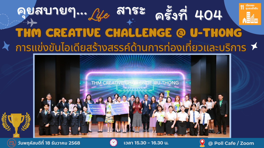 กิจกรรม “คุยสบายๆ… Life สาระ” ครั้งที่ 404 หัวข้อ : THM Creative Challenge @U-Thong การแข่งขันไอเดียสร้างสรรค์ด้านการท่องเที่ยวและบริการ พบกับ ผศ.ณัฐปรียา โพธิ์พันธุ์ รองคณบดีโรงเรียนการท่องเที่ยวและการบริการ อาจารย์ผู้ควบคุมทีม ดร.พรรษพล คำไล้ สาขาวิชาธุรกิจการโรงแรม (ชนะเลิศ) อาจารย์ชรินดา วิเศษรัตน์ สาขาวิชาผู้ประกอบการธุรกิจบริการและการท่องเที่ยว (รองชนะเลิศ) และน้องๆ นักศึกษาที่เข้าร่วมการแข่งขัน สอดคล้องกับ SDGs 11 : Sustainable Cities and Communities เมืองและชุมชนที่ยั่งยืน ในด้านการการปกป้องและอนุรักษ์มรดกทางวัฒนธรรม และการเสริมสร้างความยั่งยืนของชุมชนและเมือง