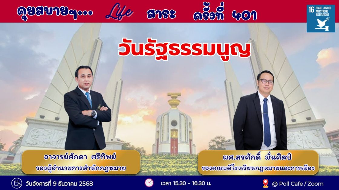 กิจกรรม “คุยสบายๆ… Life สาระ” ครั้งที่ 401 หัวข้อ : วันรัฐธรรมนูญ พบกับ อาจารย์ศักดา ศรีทิพย์ รองผู้อำนวยการสำนักกฎหมาย และ ผศ.สรศักดิ์ มั่นศิลป์ รองคณบดีโรงเรียนกฎหมายและการเมือง สอดคล้องกับ SDGs 16 : Peace, Justice and Strong Institutions (สันติภาพ ความยุติธรรม และสถาบันที่เข้มแข็ง)