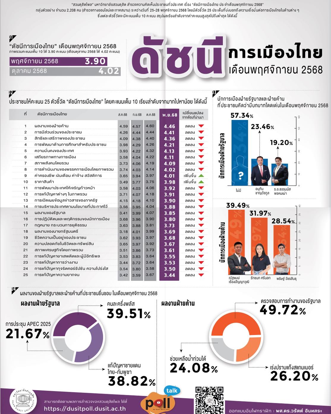 เดือนพฤศจิกายน 2568 เป็นเดือนที่การเมืองไทยเผชิญทั้งแรงกดดันจากสถานการณ์วิกฤตและความคาดหวังจากสังคมพร้อมกัน เหตุการณ์มหาอุทกภัยในจังหวัดสงขลา หาดใหญ่ ทำให้ปัญหาการบริหารจัดการภัยพิบัติของรัฐบาลถูกตั้งคำถามอีกครั้ง ขณะที่ภาวะเศรษฐกิจยังอ่อนไหวและความกังวลต่อค่าครองชีพสูงยังคงกัดกินความเชื่อมั่นของประชาชน ด้านการเมือง พรรคการเมืองทยอยเปิดตัวผู้สมัครนายกรัฐมนตรีอย่างคึกคัก โดยเฉพาะการเปิดตัวแคนดิเดตของฝ่ายค้านซึ่งได้รับความสนใจจากสังคมอย่างกว้างขวาง ส่งผลต่อทิศทางคะแนนนิยมในเดือนนี้อย่างมีนัยสำคัญ “สวนดุสิตโพล” มหาวิทยาลัยสวนดุสิต ได้สำรวจความคิดเห็นประชาชนทั่วประเทศ เรื่อง “ดัชนีการเมืองไทย ประจำเดือนพฤศจิกายน 2568” จากกลุ่มตัวอย่าง 2,208 คน ระหว่างวันที่ 25–28 พฤศจิกายน 2568 เพื่อประเมินความเชื่อมั่นทางการเมืองในรอบเดือนนี้