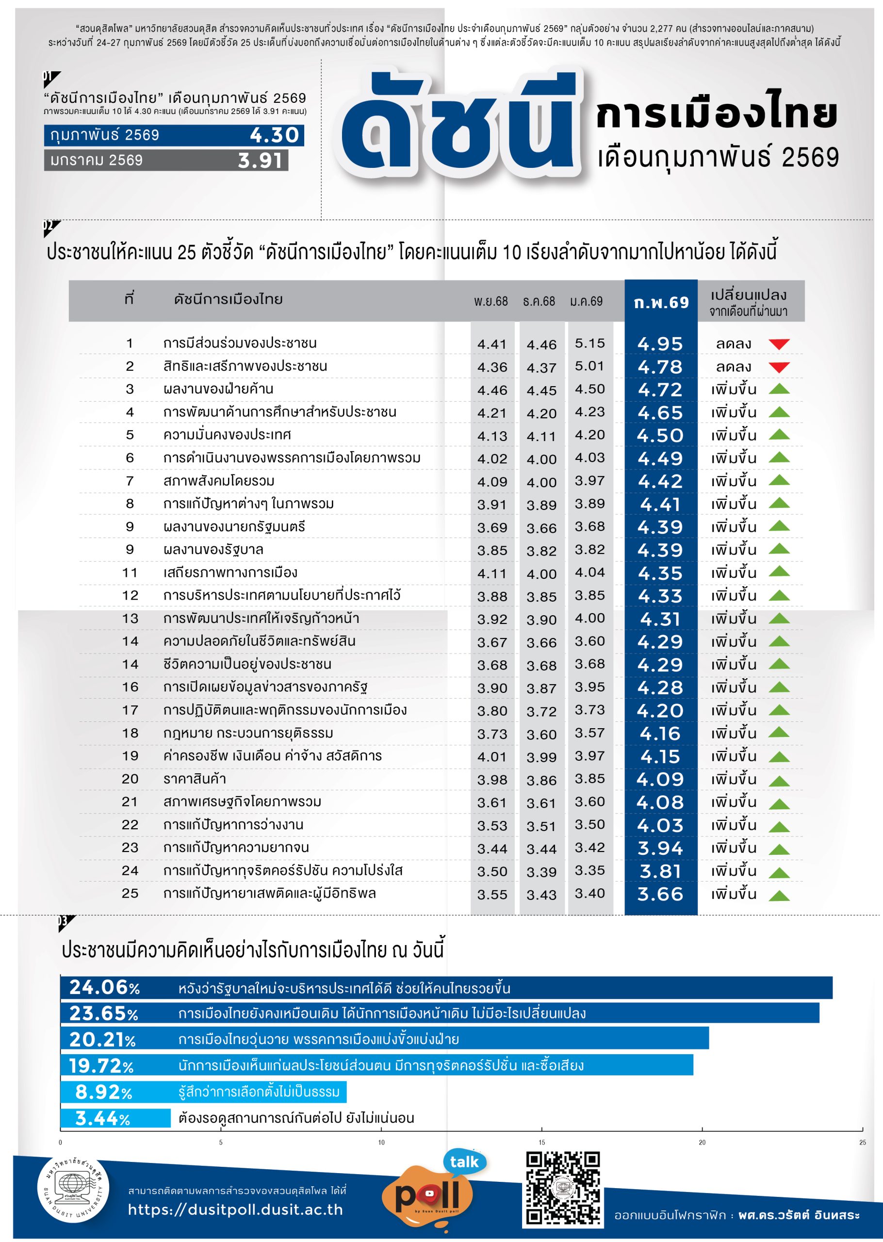สวนดุสิตโพล มหาวิทยาลัยสวนดุสิต สำรวจความคิดเห็นประชาชนทั่วประเทศ เรื่อง “ดัชนีการเมืองไทย ประจำเดือนกุมภาพันธ์ 2569” กลุ่มตัวอย่างจำนวน 2,277 คน ระหว่างวันที่ 24–27 กุมภาพันธ์ 2569 เพื่อสะท้อนระดับความเชื่อมั่นของประชาชนต่อสถานการณ์การเมืองไทยในมิติต่าง ๆ ผ่านตัวชี้วัดจำนวน 25 ประเด็น โดยแต่ละตัวชี้วัดให้คะแนนเต็ม 10 คะแนน เพื่อนำมาประมวลเป็นภาพรวมของดัชนีการเมืองไทยในแต่ละเดือน